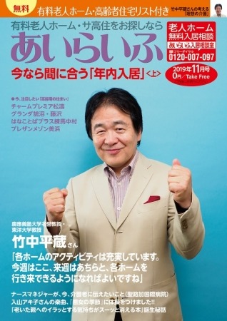 今回の表紙は、経済学者であり、小泉政権下では民間から大臣に抜擢、数々の大臣職を歴任された竹中 平蔵先生。「人間が老いていくには、赤ん坊が成人するまでと同じくらいの準備が必要。子どもの教育にはプロによる集団教育が必要なように、介護も適切な設備においてプロの手が必要」と説く竹中先生にお話をうかがいました。特集は、「今なら間に合う『年内入居』〈上〉」です。今年も残りわずかとなったこの時期に退院となった高齢の方の落ち着き先を4つに整理、老人ホームを選択する場合の、年内入居に向けてのステップとスケジュールをまとめました。
