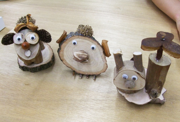 植物や昆虫、動物などの生きものをモチーフに、小枝や端材を木の輪切りに貼ってプレートを作ります。