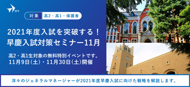AO入試・推薦入試・小論文対策の個別指導を手がける洋々(本社所在地:東京都渋谷区)は、2019年11月9日(土)及び11月30日(土)に高2・高1生対象の無料イベント「2021年度入試を突破する!早慶入試対策セミナー」を開催します。