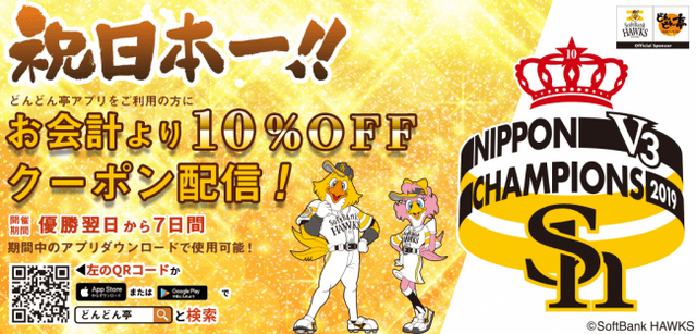 お好み焼レストラン どんどん亭(本社:Miコーポレーション株式会社/福岡市博多区)は、10月24日(木)より、オフィシャルスポンサーとして応援しております福岡ソフトバンクホークス3年連続日本一を記念して「ホークスV3達成キャンペーン」を行います。
