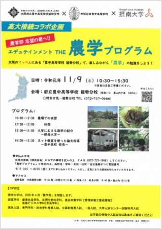 当日のプログラムでは、農場で実習を行う体験型の学習や、午後には本学から大学進学にあたって準備しておくこと、また大学の農学部でどんなことを学ぶのかといったことについて紹介する他、豊中高校の平野校長より、これからの大学入試対策を目的とした、論文指導も行っていただきます。本プログラムを通じて、高校生が農学について触れる機会を創出し、高校生の学ぶ意欲促進の手助けとなるよう今後も積極的に取り組んでまいります。