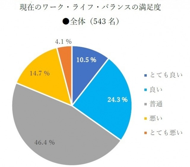 現在のワーク・ライフ・バランスの満足度について、「とても良い」(10.5%)と「良い」(24.3%)を合わせて34.8%が「良い」と回答し、「とても悪い」(4.1%)と「悪い」(14.7%)を合わせた18.8%を上回りました。その理由として、時短勤務などフレキシブルな勤務形態を挙げる方が多く、その背景に柔軟な勤務体制が普及していることが推測されます。