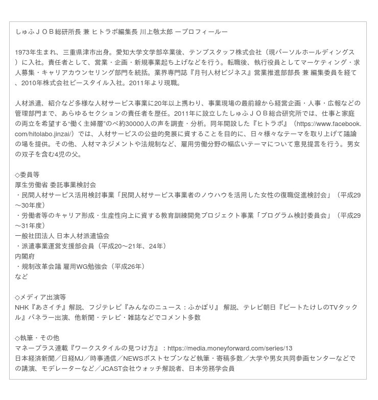 ■しゅふJOB総研 所長 川上敬太郎より
