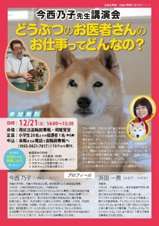 この刊行を記念し、今西先生が犬の未来ちゃんとともに、どうぶつのお医者さんのお仕事を紹介する講演会を開催します。