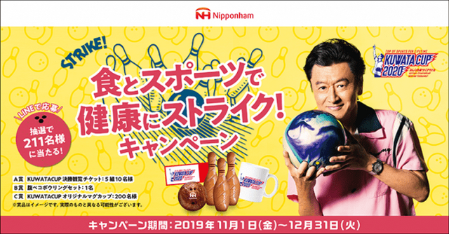 キャンペーンの応募方法は、ニッポンハムグループの公式LINEを友達登録後、クイズに挑戦いただきます。キャンペーンの商品には、「KUWATA CUP 2020」の決勝戦観戦ペアチケットや、ミートボールとソーセージに扮したボウルとピンのセットである腹ペコボウリングセット、オリジナルマグカップなどをご用意しております。