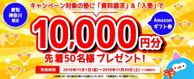 期間中に、愛知、神奈川のキャンペーン対象の塾に、塾ログから資料請求をされ、同期間内に入塾(※)された方先着50名様