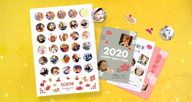 Sceneのフォトシールを使えば、市販の年賀状にペタッと貼るだけで誰でも簡単に華やかな年賀状を作成できます。