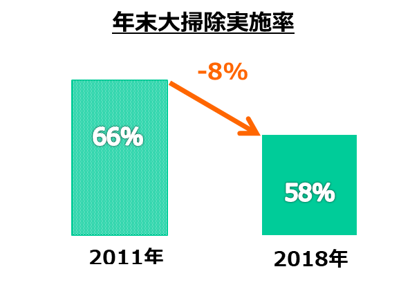 その結果、 2018年の年末大掃除実施率は58%で、2011年の66%に比べ8%減少していました。