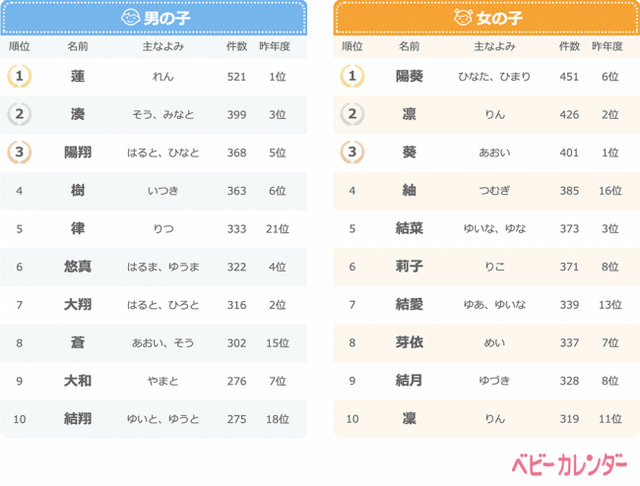 男の子、断トツ人気の「蓮」が2年連続1位!女の子は“レトロネーム”「紬」が急上昇TOP10入り