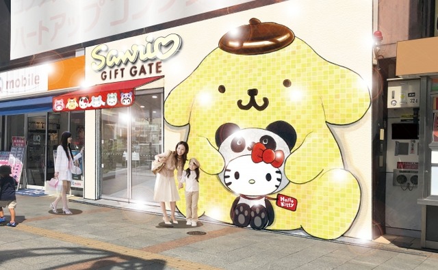 春には上野恩賜公園の桜。アメ横でショッピング。動物園。美術館をはじめとする多数の文化施設からも徒歩圏内にある中央通りに面したプラザUビル1Fに出店いたします。上野を象徴するモチーフのひとつであるパンダの格好をしたハローキティのぬいぐるみを抱えた大きなポムポムプリン(高さ約3.3m、幅約3.7m)が目印です。パンダ×ハローキティのぬいぐるみのデザインの前で記念撮影をしていただけます。