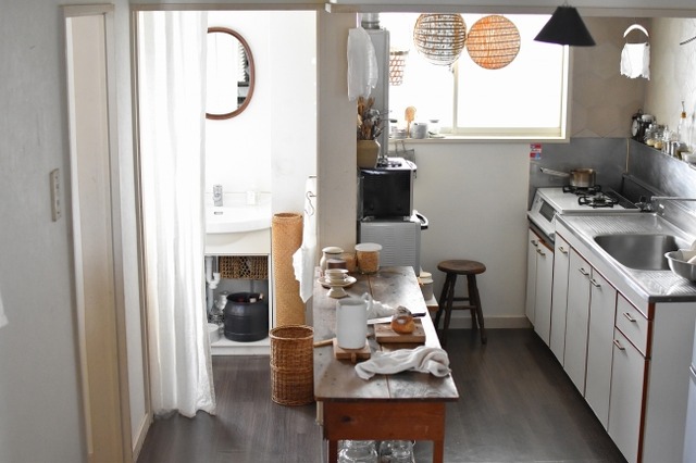 中央にアンティークの作業台を置いて使いやすくしたキッチン。調理はもちろん、カトラリーや消耗品もこの作業台に。