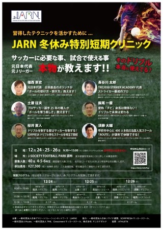 一般社団法人日本ソサイチ連盟が運営する“J-SOCIETY FOOTBALL PARK調布”において、豪華コーチ陣による冬休み特別短期クリニックが開催されますのでお知らせいたします。下記開催概要になります。ぜひこの機会にご参加ください。
