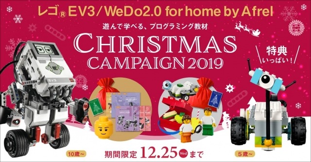 レゴ エデュケーション正規代理店、株式会社アフレル(福井県福井市、代表取締役社長 小林靖英)は、家庭学習向けレゴ(R) ロボットプログラミング教材のクリスマスキャンペーンを11月14日(木)より12月25日(水)まで実施いたします。(https://ev-3.net/)「レゴ(R) WeDo 2.0 for home by アフレル」と「教育版レゴ(R) マインドストーム(R) EV3 for home by アフレル デビューセット」を対象に、クリスマスにぴったりのギフトラッピングやレゴグッズなど期間限定の特典が付いたキャンペーンです。2020年から小学校にて必修化されるプログラミング教育を直前に控え、ご家庭でプログラミングに取り組むきっかけと体験を通じた学びを提供します。今年のクリスマスは、お子様へ「遊んで学べる特別な体験」をプレゼントしませんか。