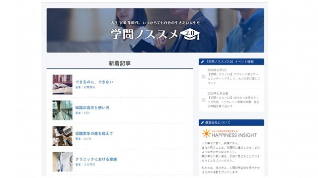 教育研修事業を手掛ける、Happiness insight合同会社(所在地:東京都港区赤坂8-4-14、代表:津田恵子)は、リカレント教育のキュレーションメディア『学問ノススメ2.0』を、2019年11月18日(月)より提供開始します。