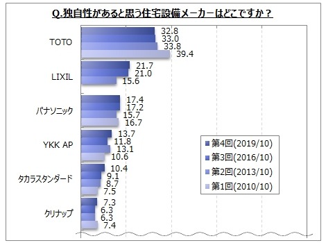 独自性がある住宅設備メーカーは(複数回答)、「TOTO」が32.8%、「LIXIL」「パナソニック」が2割前後、「YKK AP」「タカラスタンダード」が各1割強です。「いずれもない」が4割強みられます。信頼性・品質・親近感のイメージと比べて、「LIXIL」「タカラスタンダード」は順位が上位に位置しています。