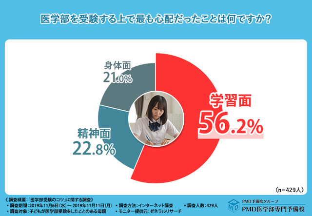 はじめに、「医学部を受験する上で最も心配だったことは何ですか?」と質問をしたところ、『学習面(56.2%)』『精神面(22.8%)』『身体面(22.0%)』という結果が出ました。