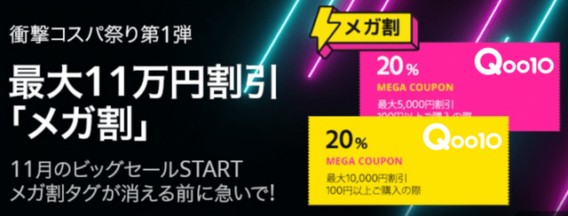セール第1弾の11月15日(金)から11月19日(火)までは、祭りを盛り上げる20%メガ割クーポンを2種発行します。
