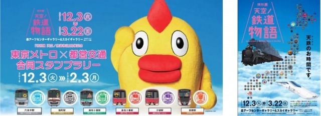 日本テレビ放送網、森アーツセンター、東京メトロ、東京都交通局では、2019年12月3日(火)より六本木ヒルズ森タワー52階で開催される、「特別展 天空ノ鉄道物語」の開催を記念し、「特別展 天空ノ鉄道物語」開催記念 東京メトロ×都営交通 合同スタンプラリーを、2019年12月3日(火)~2020年2月3日(月)まで実施いたします。