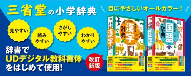 株式会社三省堂の小学生向け辞書ではこれまで、小学生が書写を正しく身につけるという観点から、学校現場の先生方のご意見を踏まえたうえで、見出し語にアンチック体と教科書体を使用していました。今回の改訂にあたり、見出しほか熟語解説など主要部分に「UDデジタル教科書体」を採用しました。