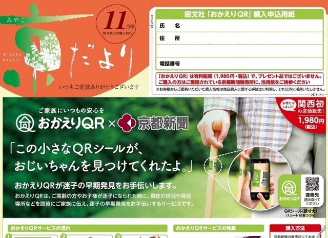 株式会社昭文社(東京都千代田区、代表取締役社長 黒田 茂夫、東証コード:9475)は、認知症の方、発達障害を始めとする障害者の方や迷子の方、遺失物等の早期発見支援サービス「おかえりQR」について、本日11月20日より一般社団法人京都新聞販売連合会(京都市中京区、理事長 岡本 喜隆)に所属する販売店(京都市内59店舗)にて取り扱いが開始されましたことをお知らせいたします。