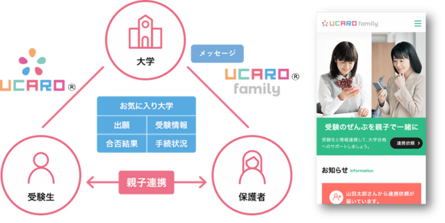 『UCARO(R) family』は、『UCARO(R)』と連携し、大学・受験生・保護者をスマートにつなぐポータルサイトです。『UCARO(R) family』により、保護者は子どものお気に入り大学、受験スケジュール、出願・受験情報、合否結果、手続状況(ステータス)等、受験に関する様々な情報を把握することができます。一方、大学は保護者のみを対象としたメッセージが配信できる等、ダイレクトな広報活動を実現することができます。