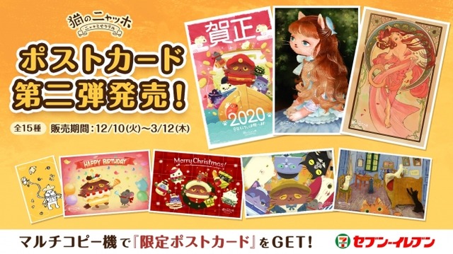 第2弾のポストカードは、前回と同様にアプリ内に登場するキャラクターのニャッホをはじめ、モネやミュシャなどの画家猫達が描いた人気絵画(10種類)と共に、クリスマスカード、年賀状、バースデーカードやなど、年末年始にすぐに活用いただける季節限定グリーティングカード(5種類)がラインナップに加わりました。この限定カードの販売は、お客様からのご要望により実現し、今回のために書き下ろされた、セブンーイレブンのコンテンツプリント限定のオリジナルカードです。