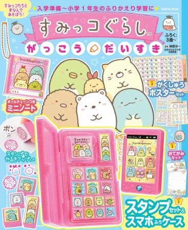 大人気「すみっコぐらし」のかわいいキャラクターたちと一緒に、入学準備~小学1年生のお勉強ができる付録つきムックです(監修・榊原洋一<お茶の水女子大学名誉教授>)。めいろやクイズ、パズル、点つなぎなどを通して、すみっコたちと遊びながら楽しくお勉強ができます。付録は、15個のスタンプがたっぷりついた「スタンプセット」、水色のジュエルが輝く「スマホふうケース」、かばんなどにぶら下げてかわいい「ボールチェーンつきミニノート」、ひらがな・カタカナ・漢字・時計の読み方をマスターできる「がくしゅうポスターセット」、すみっコ大集合の「おてがみセット」と、お子さまのやる気をアップさせるかわいいアイテムが盛りだくさんです。
