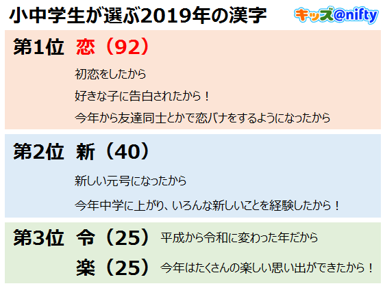 『小・中学生が選ぶ2019年の漢字』は、「キッズ@nifty」の「キッズなんでも相談」のコーナーにて、2019年をあらわす漢字と、その漢字を選んだ理由について投稿を募集し、集まった回答結果をまとめたものです。