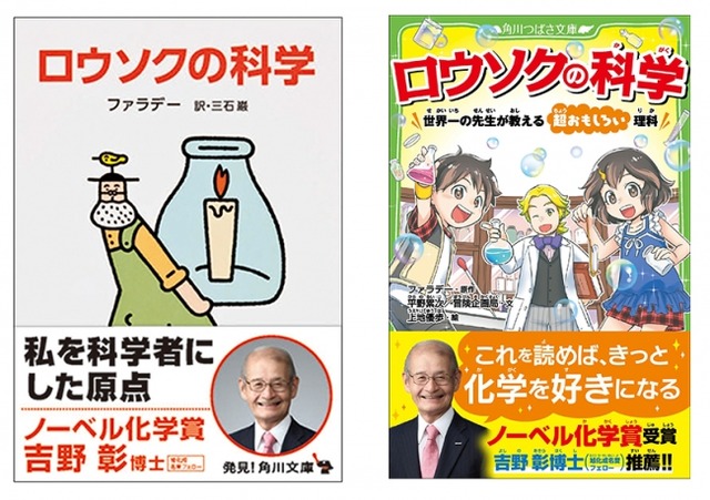 株式会社KADOKAWA(代表取締役社長:松原眞樹、 本社:東京都千代田区)は、 ノーベル化学賞受賞者の吉野彰氏からの推薦コメントを帯に掲載した『ロウソクの科学』、角川文庫版と角川つばさ文庫版を順次出荷致します。角川つばさ文庫は12月5日より出荷済み、角川文庫については12月11日出荷分より吉野彰氏の推薦コメントが入った新オビが巻かれます。 また、吉野彰氏が「化学への興味の原点」として挙げた『ロウソクの科学』は、ノーベル賞受賞報道後の累計重版が角川文庫版78,000部、 角川つばさ文庫版が70,000部となり、 2作合計で14万8000部を突破いたしました。