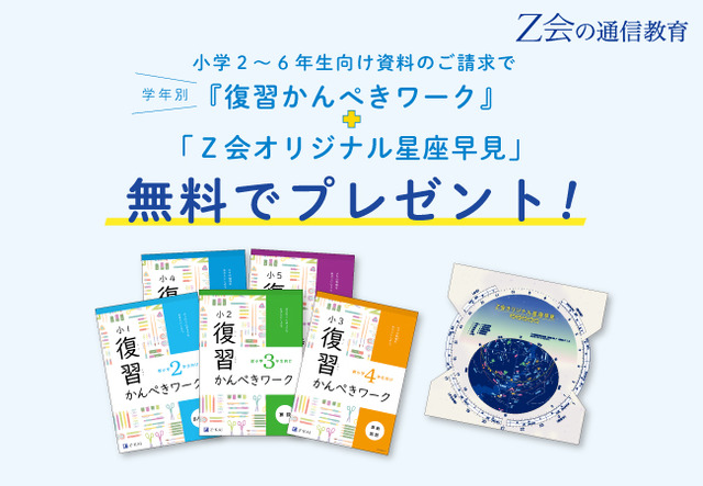 ※『復習かんぺきワーク』および「Z会オリジナル星座早見」は、小学生向けコースの資料をご請求いただいた方に、お子さまの学年に応じてお届けいたします。新小学5・6年生の方は「小学生コース」または「小学生タブレットコース」の資料をご指定ください。中学受験コースの資料には同封されません。
