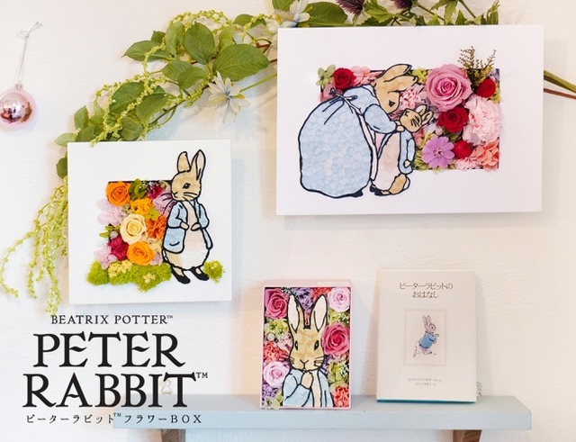 「ピーターラビット™キャラクターフラワー」は、世界的に有名な青い服を着たいたずら好きなうさぎ・ピーターラビットのおなじみの絵柄を表現したプリザーブドフラワーアートとなります。