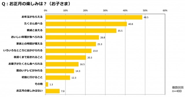 3歳から9歳までの子どもを対象に、お正月の楽しみについて尋ねたところ、最も多かった回答は「お年玉がもらえる」(48.5%)だった。以下、「たくさん遊べる」(40.8%)、「親戚と会える」(35.5%)と続いた。