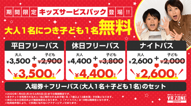 VR ZONE OSAKAは14種のアクティビティが遊び放題で楽しめる「フリーパス」を2019年7月より導入しています。2020年の初頭は、春休みまで期間限定の「キッズサービスパック」を使って、ファミリーでお得にVR体験をお楽しみください。