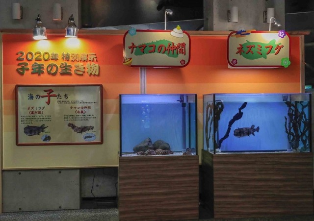 展示生物は来年の干支・子(ネズミ)にちなんだ名前が付いた海の生き物で、顔がネズミに似ていることから名付けられたと考えられる「ネズミフグ(鼠河豚)」1種類と、漢字で「海鼠」と書く「ナマコ(海鼠)の仲間」2種類、計3種12点です。