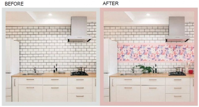油や水はねなどなどが気になるキッチン周りは、掃除やお手入れが面倒なので、汚れたら剥がして新しく貼り替えられるリムーバブル ウォールペーパーが大活躍します。