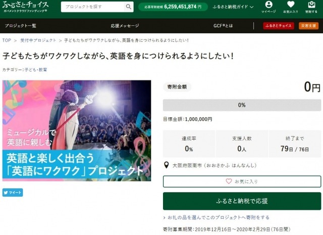 大阪府阪南市とふるさと納税総合サイト「ふるさとチョイス」を企画、運営する株式会社トラストバンク(本社:東京都目黒区、代表取締役:須永珠代、以下「トラストバンク」)は本日12月16日、トラストバンクが提供する、ふるさと納税制度を活用したクラウドファンディング型で寄附を募る仕組み「ガバメントクラウドファンディング(R)」(以下GCF)において、楽しんで英語を口にする子どもたちを育てることを目的としたプロジェクトを開始します。募集期間は2019年12月16日~2020年2月29日、目標寄附金額は100万円です。