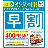 スシローのおすしでお父さんをねぎらおう!父の日のお持ち帰りなら、ネット注文がお得!対象条件(※)のもとでご注文いただくと“400円引き”!