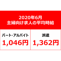 【主婦求人の平均時給 2020年6月】パート・アルバイト:『1,046円』、派遣:『1,362円』