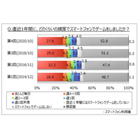 【スマートフォンでのゲーム利用に関する調査】直近1年間にスマートフォンでゲームをした人は、スマホ利用者の4割強。ほとんど毎日する層では、1日「30分以上」が5割弱。利用意向は3割弱