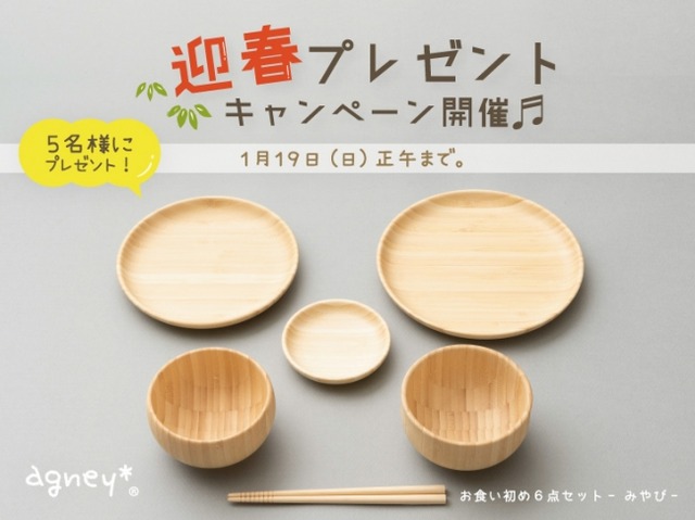 天然素材製品の製造販売を手掛ける仲吉商事株式会社(本社:東京都板橋区)は、ベビー・こども向けオリジナル食器の自社ブランド「agney*(アグニー) https://www.agney.jp」にて、天然孟宗竹(もうそうちく)で作り上げた新作「お食い初め6点セット-みやび- 」を発表。1月中旬より順次、有名百貨店をはじめ各通販サイトにて発売を開始いたします。発売に先駆け、 1月19日(日)正午までInstagramにて“迎春プレゼントキャンペーン”を開催。 抽選で5名様に新商品をプレゼントいたします。 (Instagram応募ページ▶︎https://www.instagram.com/p/B69Sw2SpMLh/ )
