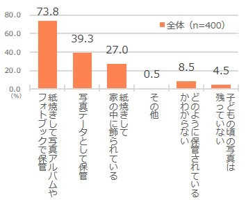 保管方法は、紙焼きした写真アルバムやフォトブックが主流で73.8%を占める