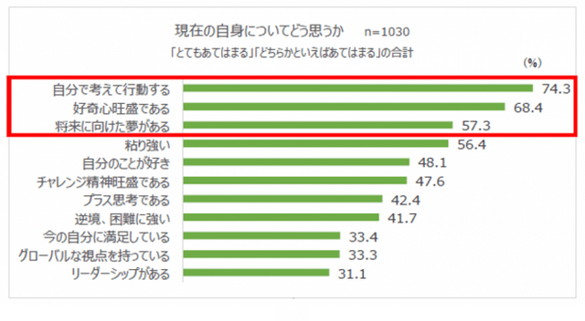 その結果、新成人は自身について約7割が「自分で考えて行動する」(74.3%)「好奇心旺盛である」(68.4%)、約6割(57.3%)が「将来に向けた夢がある」という自己評価が高いことがわかりました。また、こうした自己評価が高い人は、高くない人よりも幼児期に保護者から「やりたいことを大切に」してもらったと感じている傾向があることがわかりました。主な調査結果は以下のとおりです。