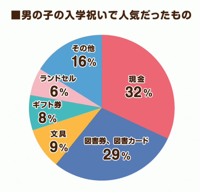 男の子向けの入学祝いでもっとも多かったのは「現金」で32%で、次点は「図書券、図書カード」の29%でした。