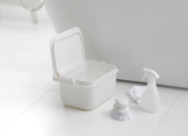 この度の『バケツ』は、浸け置きや掃除などの使いやすさにこだわり、コンパクトなスクエア型でフタ付きにしました。スクエア型のため、部屋の角に隙間を作らず置いておけます。容量は約5Lとコンパクトで洗面台でも注水しやすいかたちです。