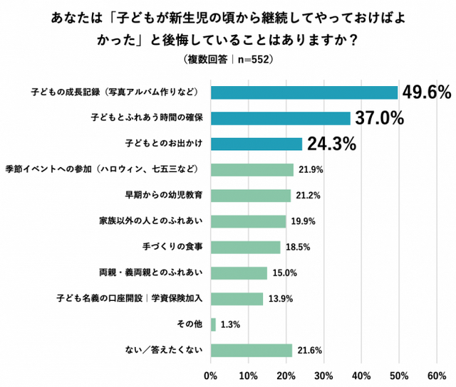 3~5歳の子どもを持つママに「子どもが新生児の頃から継続してやっておけばよかったと後悔していること」を質問したところ、TOP3は、1位「子どもの成長記録(写真アルバム作りなど)」(49.6%)2位「子どもとふれあう時間の確保」(37.0%)3位「子どもとのお出かけ」(24.3%)であることがわかりました。