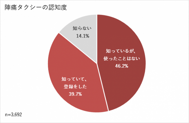 本調査の前に行った予備調査において、「妊娠・出産の経験がある」と答えた女性3,692人のうち、86%にあたる3,171人が「陣痛タクシーを知っている」と回答しました。そのうちさらに「サービスに登録した」と答えた方は1,467人にのぼり、認知率および利用率ともに高く、妊娠をされた女性の間では欠かせないサービスの一つになっています。