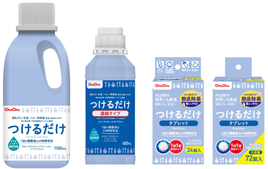 「つけるだけ1,100mL」「つけるだけ濃縮タイプ400mⅬ」は食品添加物なので、水で溶液を洗い流す必要がなく、1回の調製で24時間有効なため、忙しい育児の手間を省けます。