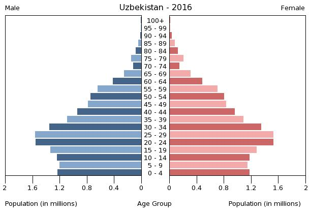 (※1)ウズベキスタン共和国の人口分布図(2016年) The Central Intelligence AgencyWEBサイトより
