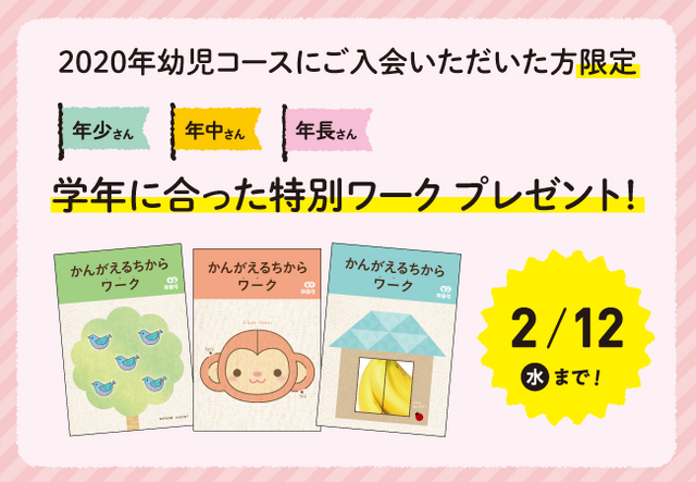 株式会社増進会ホールディングス(Z会グループ)のグループ会社である株式会社Z会は、「Z会の通信教育」幼児コースにおいて、期間限定特典『かんがえるちからワーク 準備号』がもらえる入会キャンペーンを2020年2月12日(水)まで実施しています。ぜひこの機会にお申し込みください。
