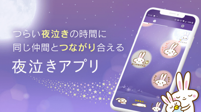 「月夜のうさぎさん」は、夜泣き対応中のママやパパ同士がアプリを通して繋がり合い、つらい夜泣きの時期を乗り切ろう! というコンセプトのアプリです。
